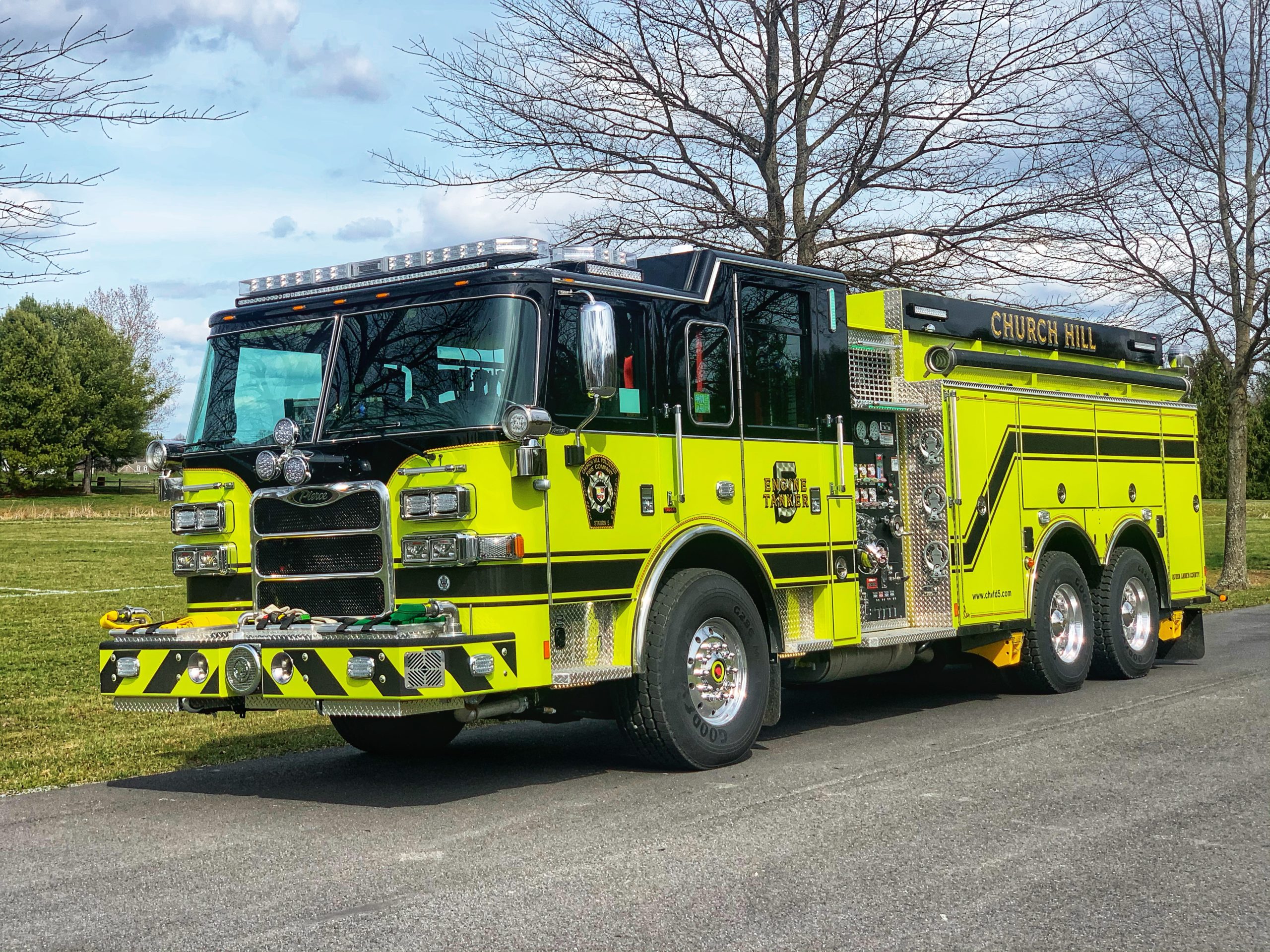 Engine Tanker 5 is a 2019 Pierce Arrow XT Custom Pumper built on a TAC 4 independent front suspension, with seating for six personnel. The unit is powered by a 525hp Detroit Diesel DD13 engine coupled with an Allison Gen V, 6 speed automatic transmission. The unit has a Waterous 1,500 g.p.m. single stage pump with a 2500 gallon poly tank. A 10-inch Newton electric powered Kwik-dump is located in the rear of the unit. Engine Tanker 5 also has front & side air bags for crew safety and protection. There are three pre-connected front bumper lines, two 1 ¾” at 200′ and a 1 ½” trash line at 100′. There is also one 200′ 2 ½” cross-lay and one 1 ¾” 300′ rear attack line. Engine Tanker 5 also carries 600′ of 3″ line and 1,500′ of 4″ LDH and assorted appliances. A Harrison 3.6 KW generator supplies electrical power to the emergency scene through a 200′ electrical cord reel. The unit features all LED emergency lighting as well as LED scene lighting mounted on the front brow, on each side and in the rear. Engine Tanker 5 key equipment features include: six (6) SCBA w/ spare cylinders, Bullard QXT thermal imaging camera, Elkhart R.A.M. monitor, two portable Streamlight battery operated LED scene lights, Blow Hard BH20 battery operated PPV fan, Stihl MS271 chainsaw and assorted hand tools. Engine Tanker 5 is the first piece of apparatus in Church Hill history to feature a black-over-yellow paint scheme. An updated graphics package including a black and gold patch is also featured on the unit. Engine Tanker 5 is typically first-due to all fire related incidents in non-hydrant areas and third due to rescue incidents. It was placed in service on February 24, 2020.